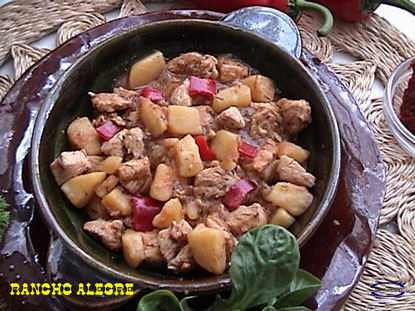 250 grs. de carne picada, 1 cebolla picada, 1 ajo picado, 2 papas peladas y picadas en cubos medianos 1 pimentón rojo picado o 1 chile rojo picado, 1/2 taza de puré de tomate 2 tazas de tomate fresco picado, tomillo, sal, y salsa de soja al gusto