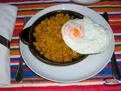 1 taza de carne, jamón de pavo o pollo picado 2 ajos prensados 1 puerro picado 3 cucharadas de soja japonesa 2 tazas de arroz cocido del día anterior 1 cucharada de chile (sambal) 2 cucharadas de aceite de mani 1 cucharadilla de curcuma sal y pimienta al gusto 1 huevo por comensal 2 cucharadas de perejil picado al servir u otra hierba .