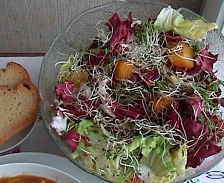 Dos horas antes de servir se lavan las hojas de las lechugas y se escurren, se meten en una bolsa de plástico, se cierra herméticamente y se mete al refrigerador. Quedan crujientes. Agregue los germinados y el encurtido. Sazone con el aderezo. Agregue semillas de girasol o nueces si lo desea