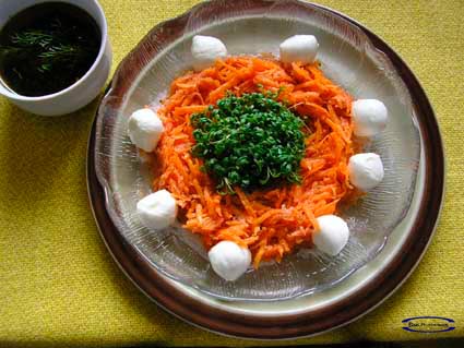 Se ralla la zanahoria , se le agrega el berro, se mezcla y se rocea con el limón y la Salsa Raquel al servir.