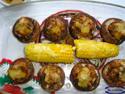 2 champiñones grandes por comensal Finamente picado: 2 hojas de hinojo, solo lo blanco, 2 papas medianas cocidas, 2 cebollinos raíces , blanco y verde, 1 cucharada de jengibre, 2 cucharadas de apio, 2 cucharadas de ramas de perejil 1 cucharada de soja 1 tomate grande pelado y sin semillas sal y pimienta al gusto