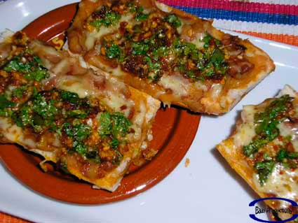 Se pica el jitomate, la cebolla, el chile y el cilantro todo finamente y se pone en una basijita. Se añade el jugo del limón y sal a gusto. Se sirven en un patón y se adornan con la salsa casera de la salsera.