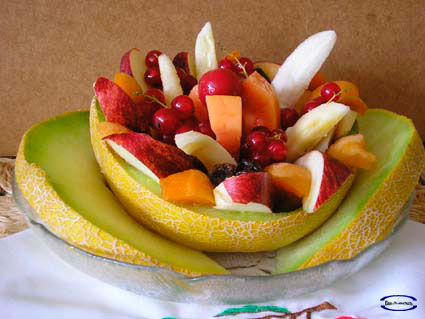 Se lavan las frutas y se cortan en trozos pequeños El melón se parte a la mitad, sacando la pulpa en forma deseada, bolas, cuadros etc. Se decora el melón con las frutas en trozos pequeños, se rocía con el jugo de limón mezclado con la miel. Opción: Se pueden añadir bolas de sorbete de limón o algún helado al gusto.