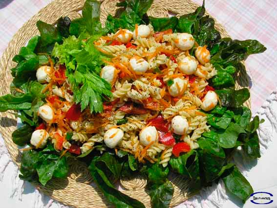 Ponga en una charola de servicio cúbrala con hojas de lechuga Coloque la pasta sazonada con los ingredientes, adórnelo con hojas de apio y al final ponga los Mozarelitos Si lo desea puede agregar rodajas de rabanitos