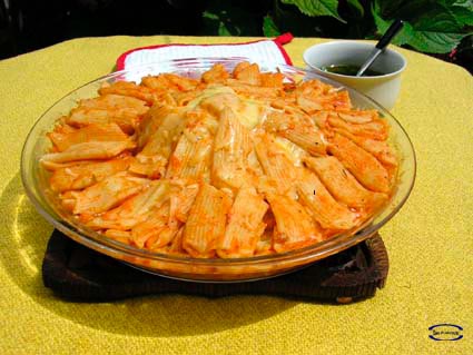 Llena una olla con 5 litros de agua, agregue dos cucharadas de aceite de maíz y sal al gusto. Al hervir el agua agregue la pasta y cocine hasta que este al dente. Enjuague con agua fría para que no se pegue.