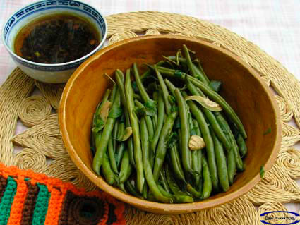 Lave los ejotes o vainitas, acomódelos en una sartén agregue el liquido y las cascaras de jengibre cepilladas, y la sal. Cocínelos 20 minutos a fuego lento. No importa si el líquido se acaba, procure que no queden secos y que no se peguen en el sartén.