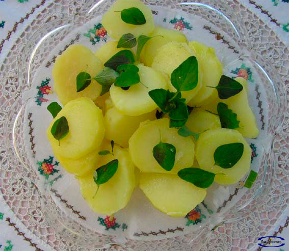 Cubrir las papas con agua en un sartén, sal de mar con algas marinas al gusto, y ramas de mejoran fresca, si no tiene utilice el doble seca. Cocine las papas durante 20 minutos, procurando que no se desbaraten al servir. Rocíe las papas con Salsa Raquel y mejoran. Sirve para acompañar cualquier platillo o bien solas.