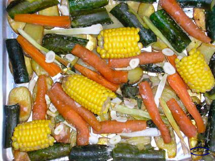 Baje la temperatura a 180° y hornearlas durante 10 minutos. Abra el horno y acomode las zanahorias, calabacines, elotes y los cebollinos y las laminas de ajo, agregue aceite de oliva y las hierbas, hornee 10 minutos más. Sírvase con Salsa Raquel con crema agria y Yoghurt con requesón.